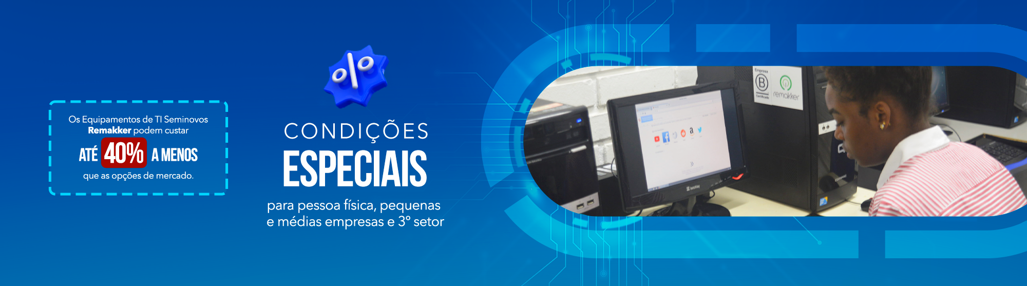 Nesta jornada pela tecnologia do bem, oferecemos a oportunidade de adquirir notebooks, desktops e monitores com o melhor custo-benefício do mercado, apoiando a Inclusão Digital. Conheça a opção e a experiência de adquirir equipamentos de TI Remakker, que contam com certificado de origem, 12 meses de garantia, assistência técnica especializada e produtos de alta qualidade.